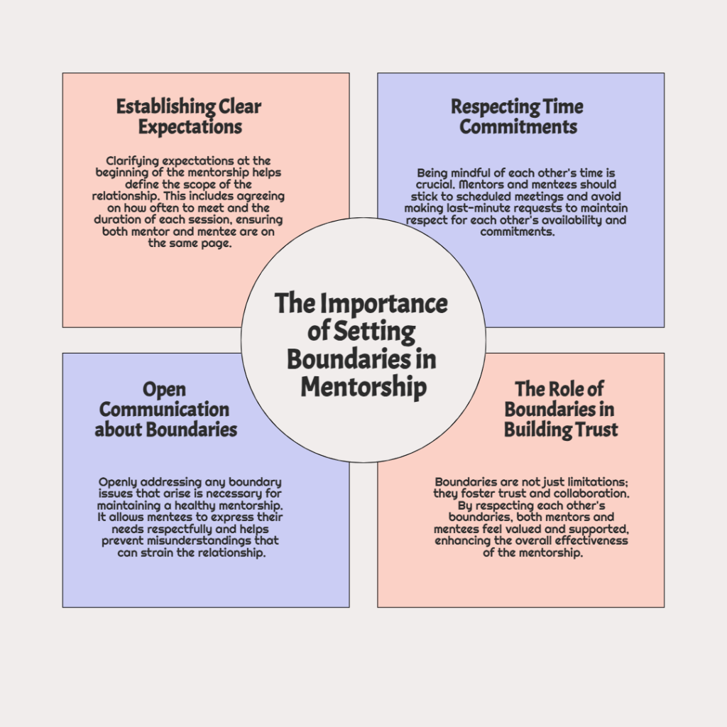 Healthy boundaries are essential for any successful mentorship relationship. Without them, mentees may feel overburdened or mentors may feel undervalued. Setting boundaries doesn’t mean saying “no” to everything; it’s about defining limits that preserve mutual respect.