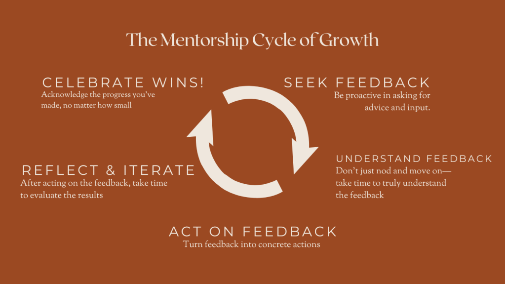 Feedback fuels growth, but its real power lies in how you use it. The Mentorship Cycle of Growth—seeking, understanding, acting on, reflecting, and celebrating feedback—ensures you turn advice into meaningful progress. It’s a dynamic process that not only builds skills but also strengthens your relationship with your mentor. By proactively seeking feedback, breaking it into actionable steps, and sharing your progress, you create a loop of continuous improvement. Whether you’re refining your communication, leadership, or technical skills, this approach helps you evolve at every stage.