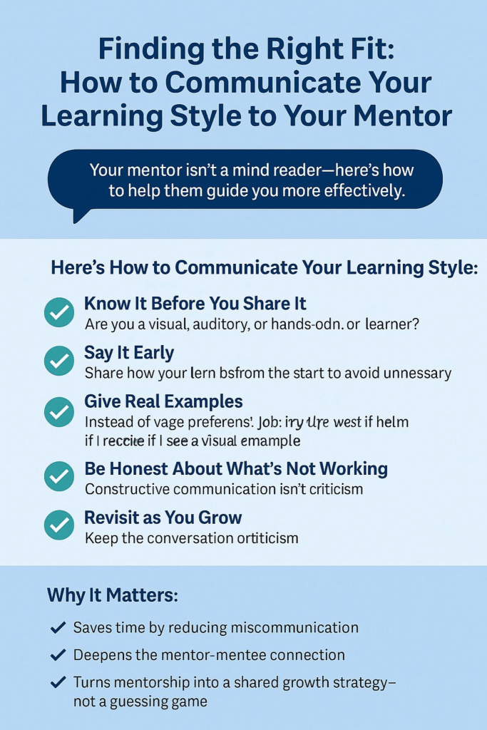 Mentorship works best when you lead with clarity. When you articulate how you learn, you empower your mentor to meet you where you are—and accelerate your personal and professional growth.