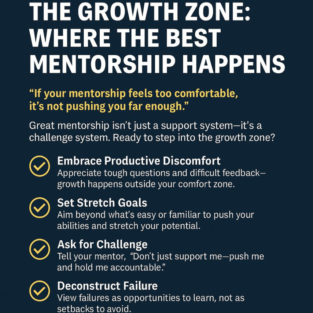 Sure, support matters. But real mentorship doesn’t just support you—it stretches you. It challenges your assumptions, pushes your boundaries, and invites you into the growth zone—that critical space between your current abilities and your untapped potential.